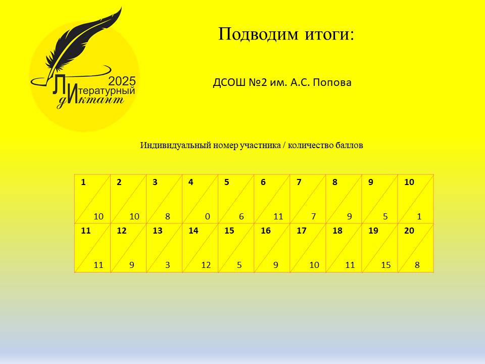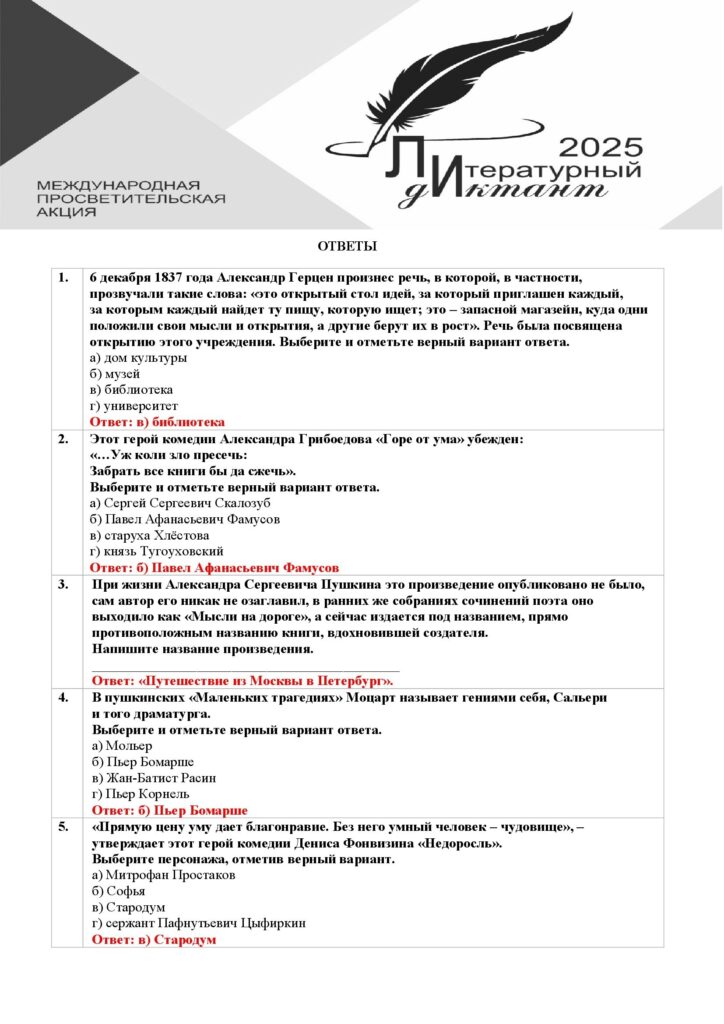 Участников Диктанта ждали 20 вопросов в тестовой форме с открытым ответом. Узнать свой результат участники акции нашей площадки могут на официальном сайте МБУК «ДМЦБ им. А.Ф. Мерзлякова» https://biblio.udokms.ru//, а правильные ответы на тестовые задания появятся на сайте литдиктант.рф 01 октября. Благодарим всех, кто присоединился к «Литературному диктанту»!