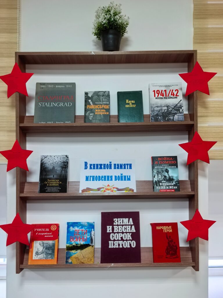 Уважаемые читатели и гости библиотеки! Приглашаем вас посетить книжную выставку «В книжной памяти мгновения войны», посвящённую месячнику оборонно-массовой и военно-патриотической работы.